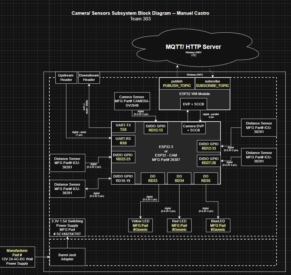 Below is a block diagram showing the communication between the camera sensor, the ultrasonic distance sensors, the WiFi module on the ESP32, and the bidirectional serial communication via UART to other subsystems.